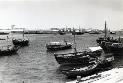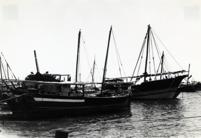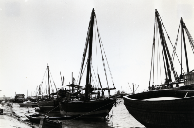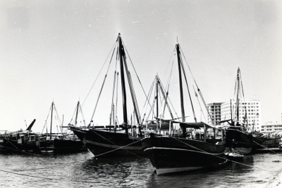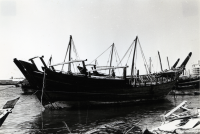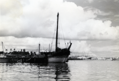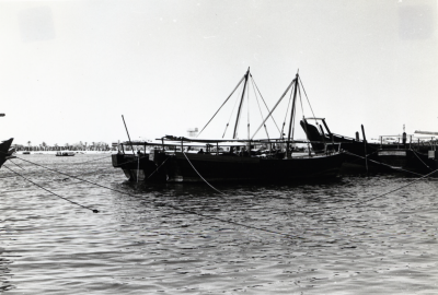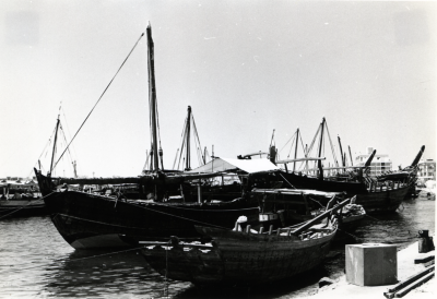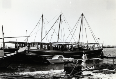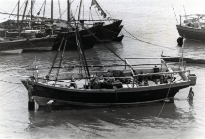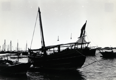 Dhangis, afgemeerd, op de achtergrond twee minaretten.
