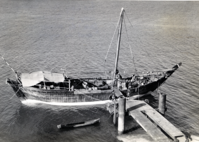Bûm, schip met één mast, blik op de bakboordzijde.
