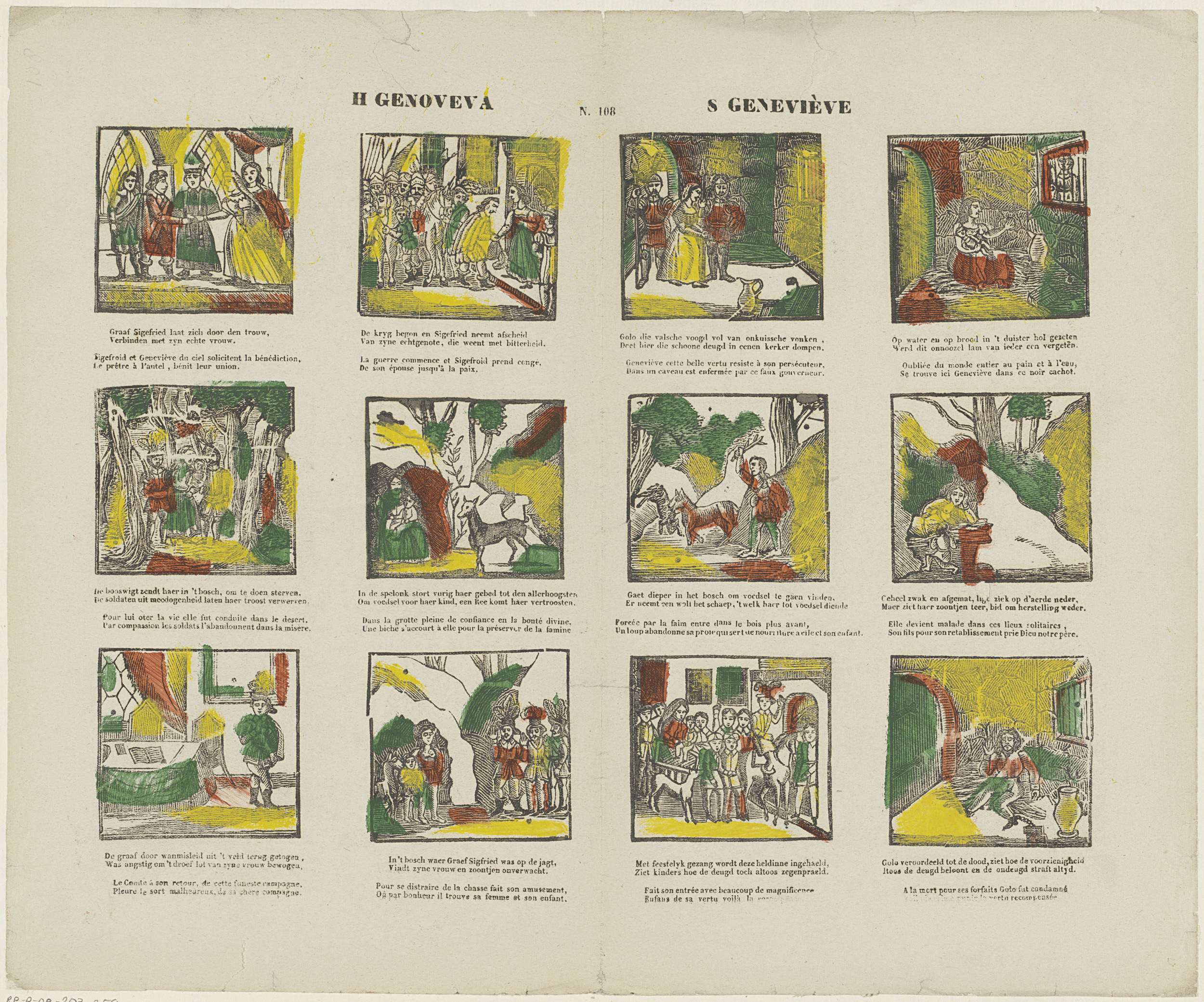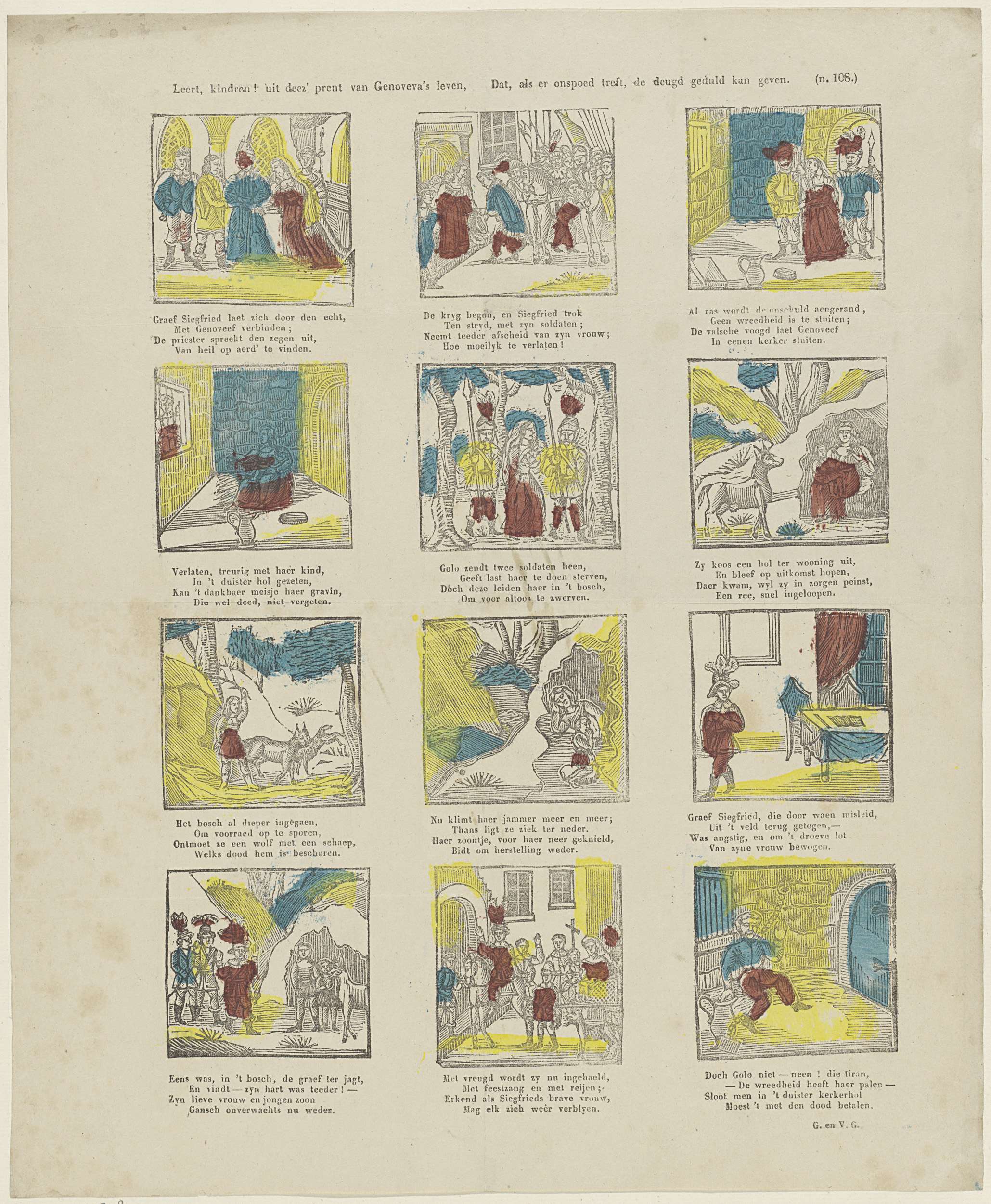 Leert, kindren! uit deez' prent van Genoveva's leven...