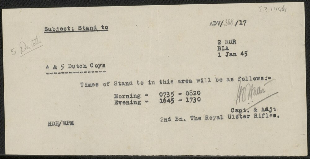 Bericht over tijden voor stand to, 2 RUR, BLA, 1 Jan 45