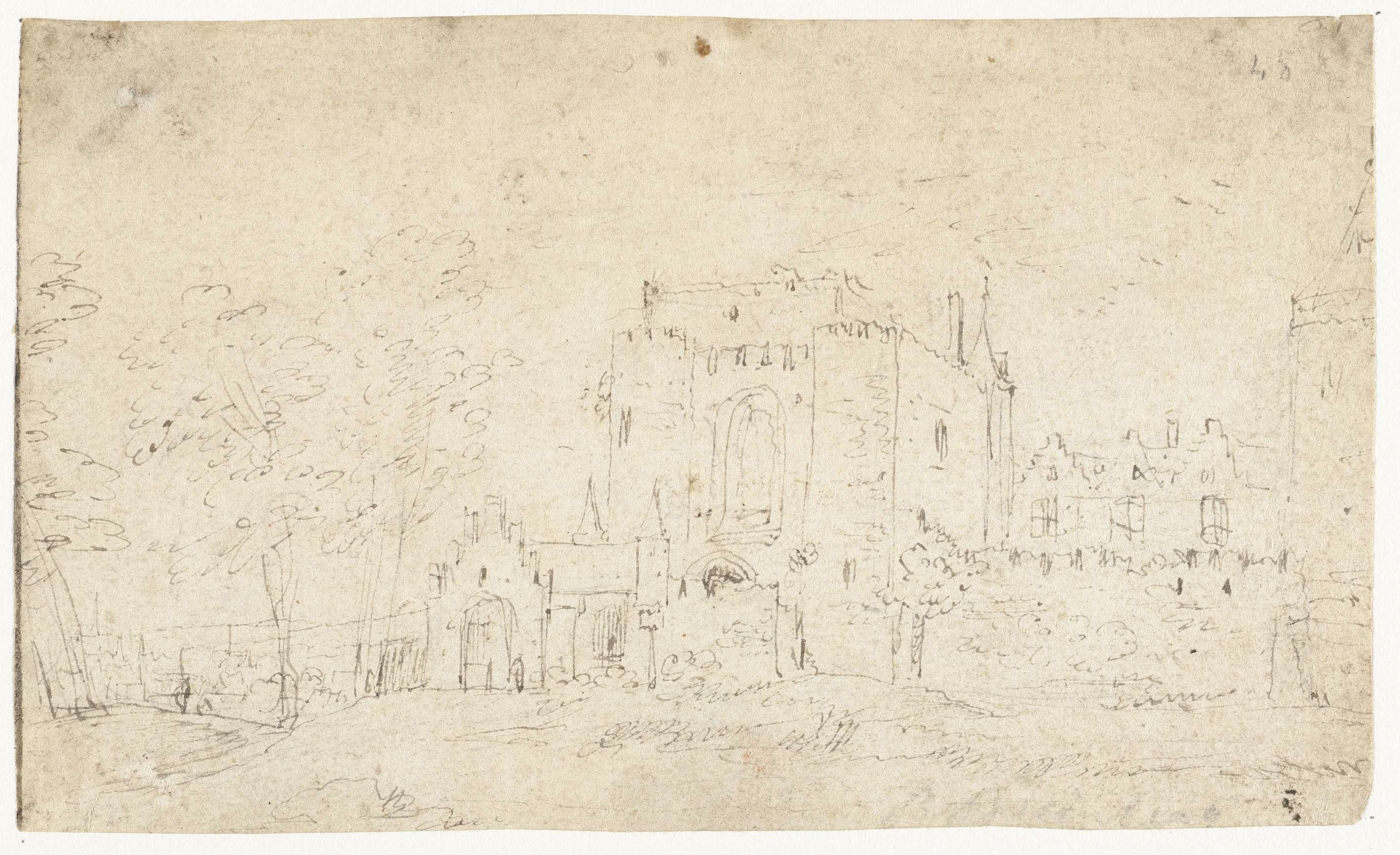 Zuidelijk landschap met kasteel, vee en wandelaars