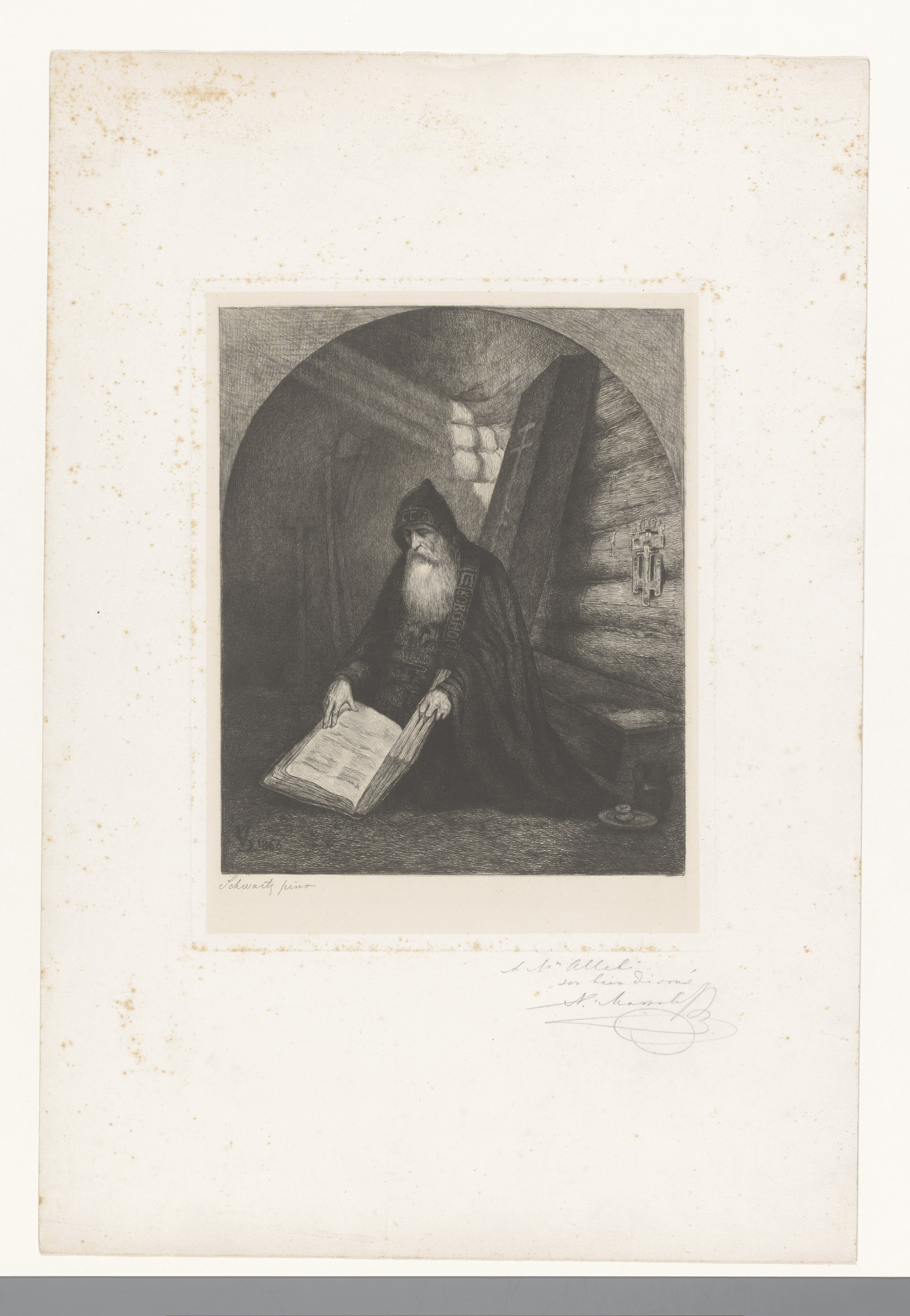 Orthodoxe monnik of kluizenaar knielend met een open...