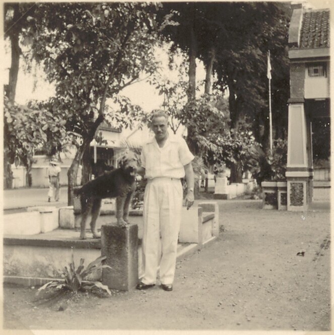 Europese man met hond voor het hotel 'Merdeka