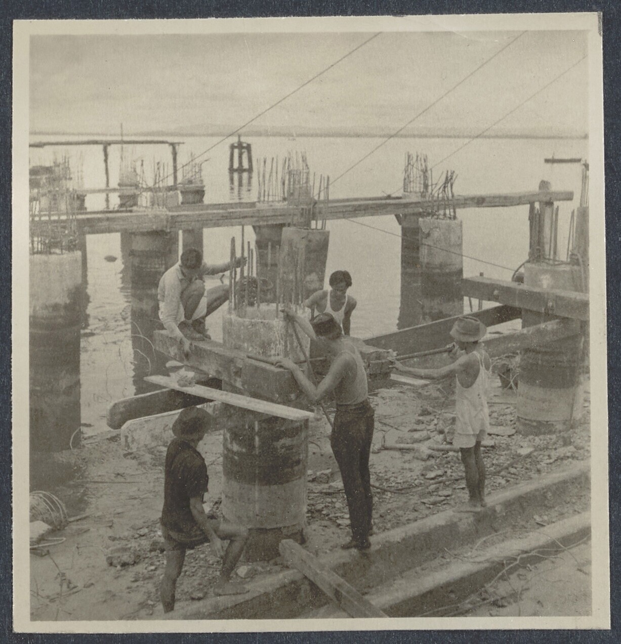 Het heien van palen bij een dam in aanbouw