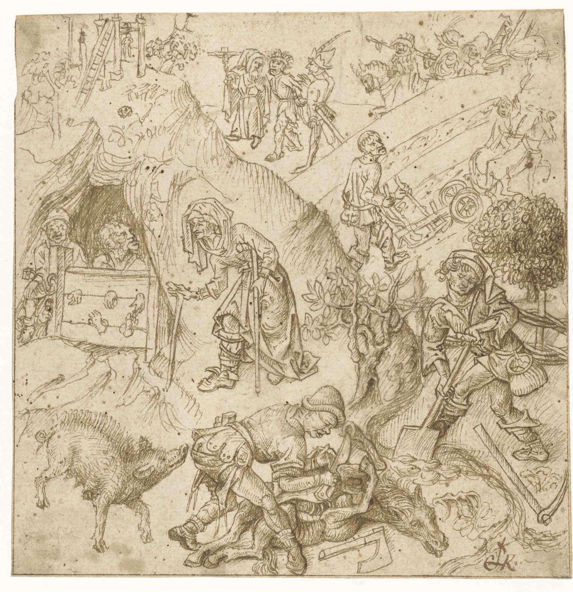 Schets van vrouw met kind en schets van vegende of d...