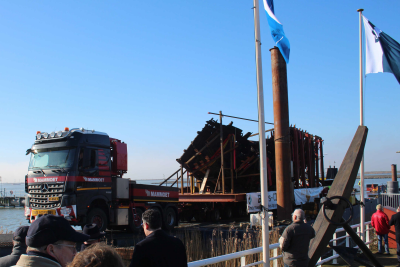 De IJsselkogge komt op een grote dieplader aan wal o...