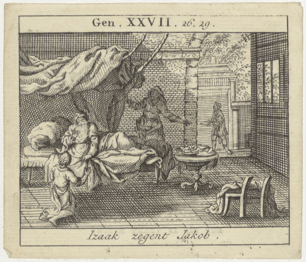 Isaak zegent Jacob (Gen. 27:26-29), kz. Bid voor zie...