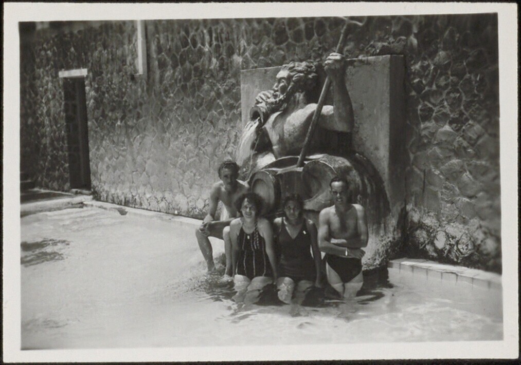 Groepsportret in een zwembad bij een beeld van Neptunus