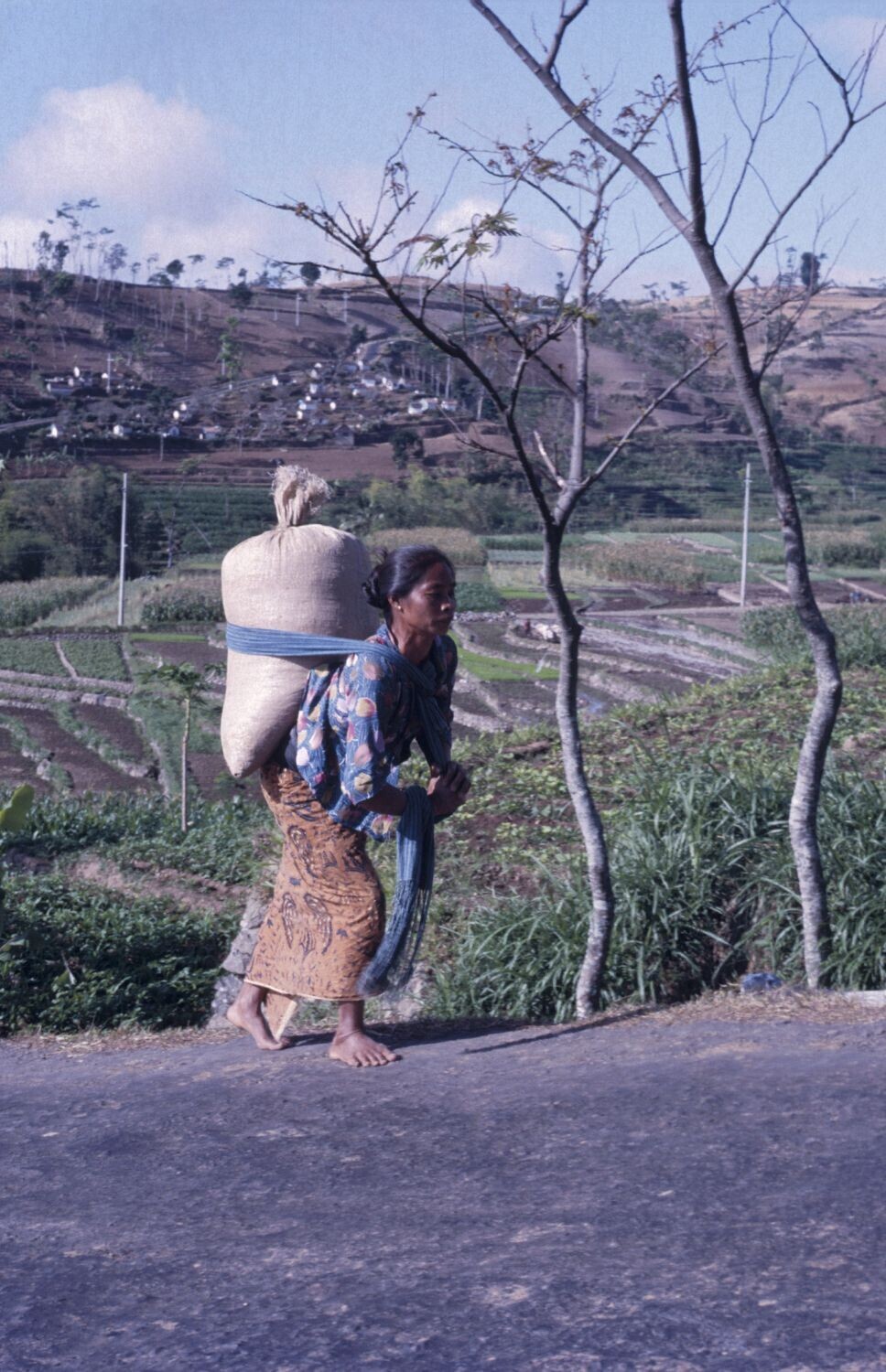 Vrouw met een zak rijst op haar rug op weg naar de m...