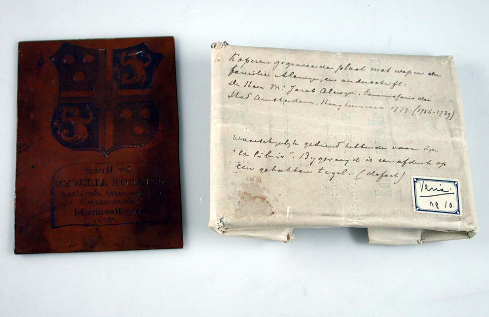 Koperen plaat gegraveerd met wapen familie Alewijn e...