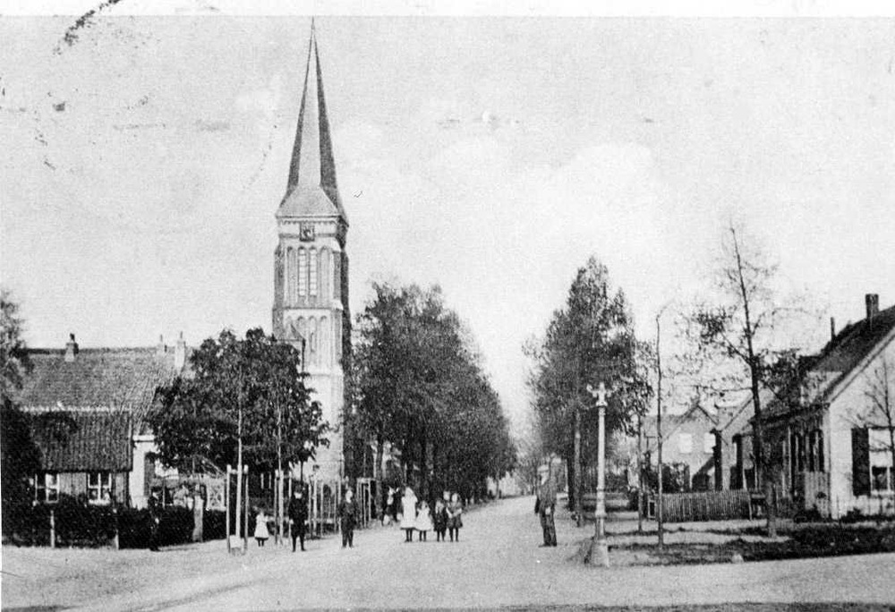 Gezicht op de RK-kerk in 1913. Rechts een straatlant...