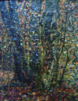 Bosgezicht. Tussen de bomen door valt het zonlicht