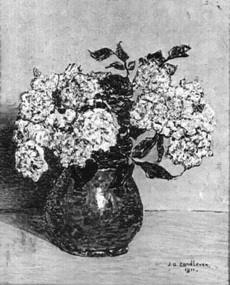 Stilleven met een klein bruin aarden pot, gevuld met...
