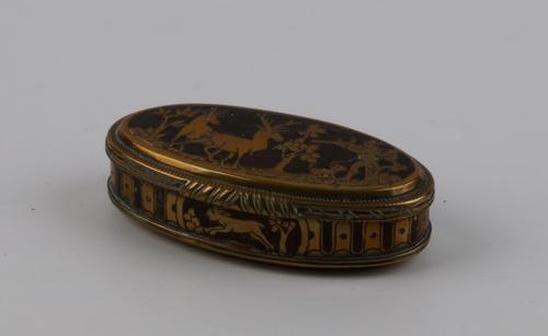 Koperen tabaksdoos met voorstelling van een jachttaf...