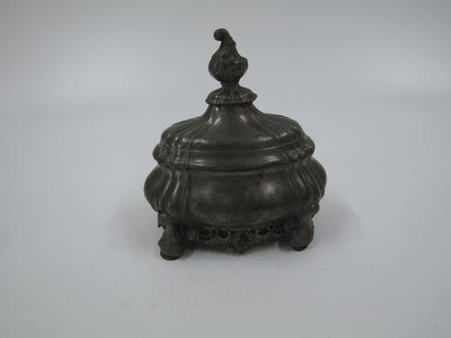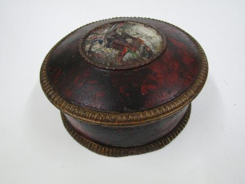 Ronde tinnen tabakspot met beschilderd deksel