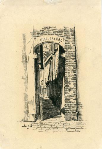 Tekening met potlood van een steegingang aan de Gods...