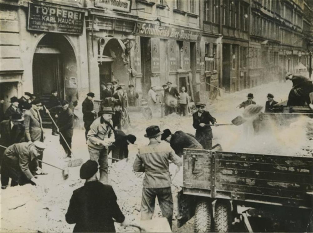 burgers die met schoppen puin op dumpwagens spitten