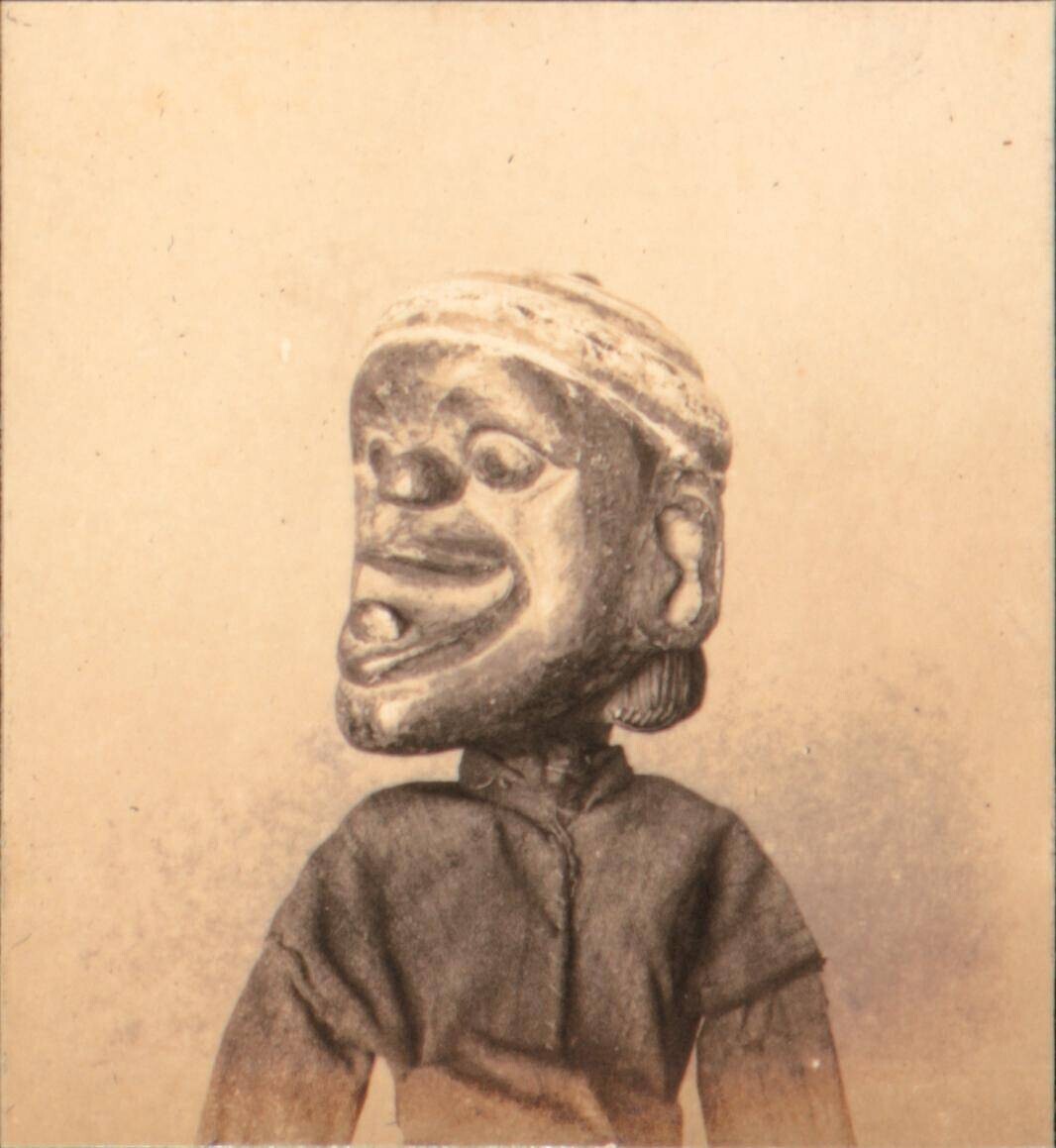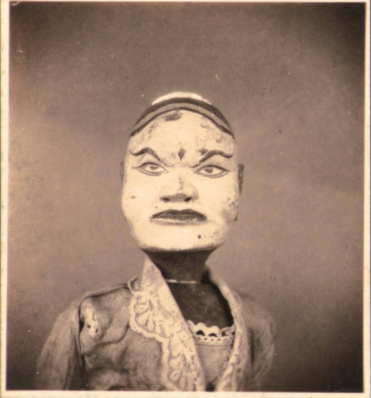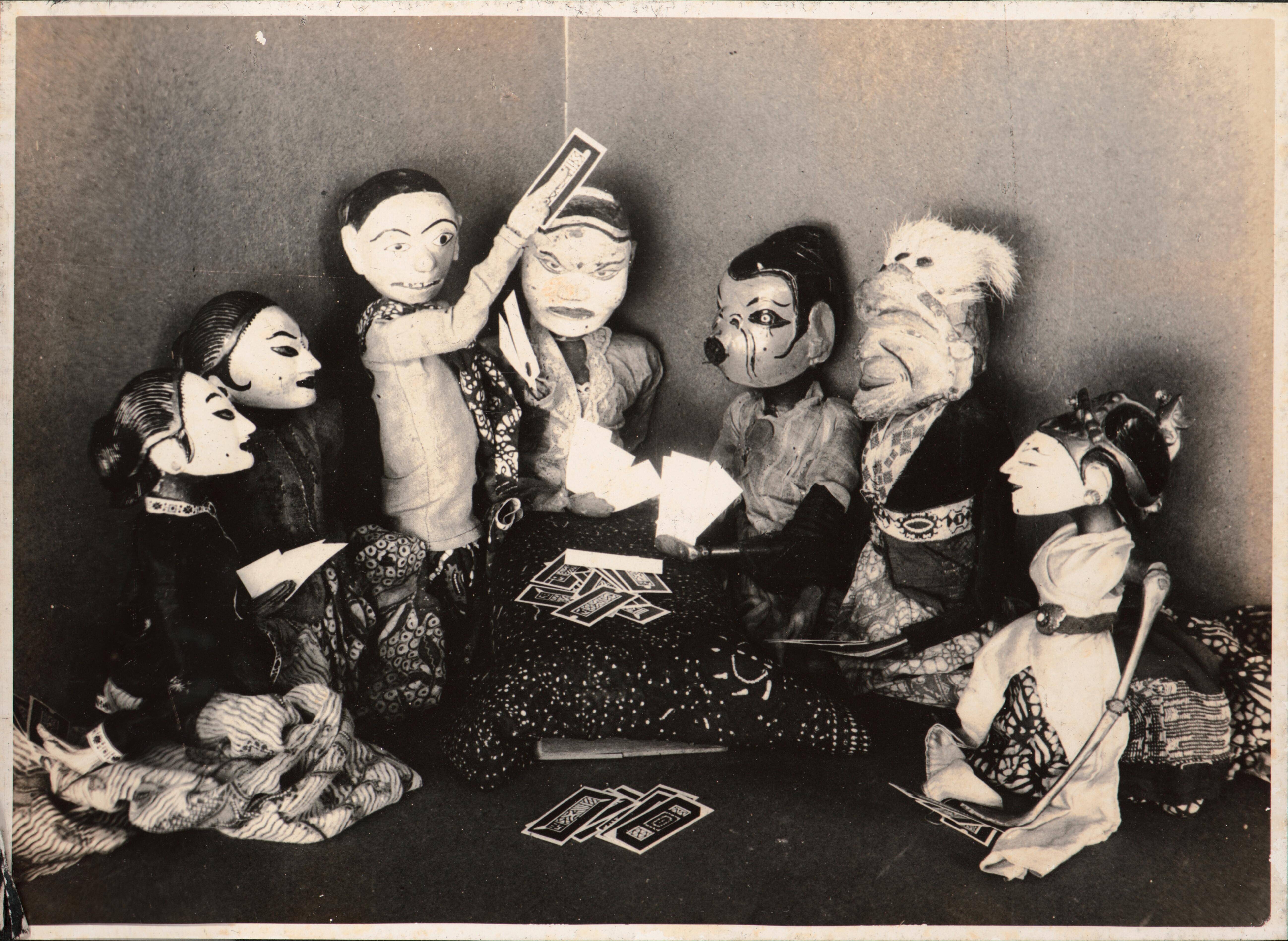 Groepsportret van wajangpoppen die een kaartspel spelen