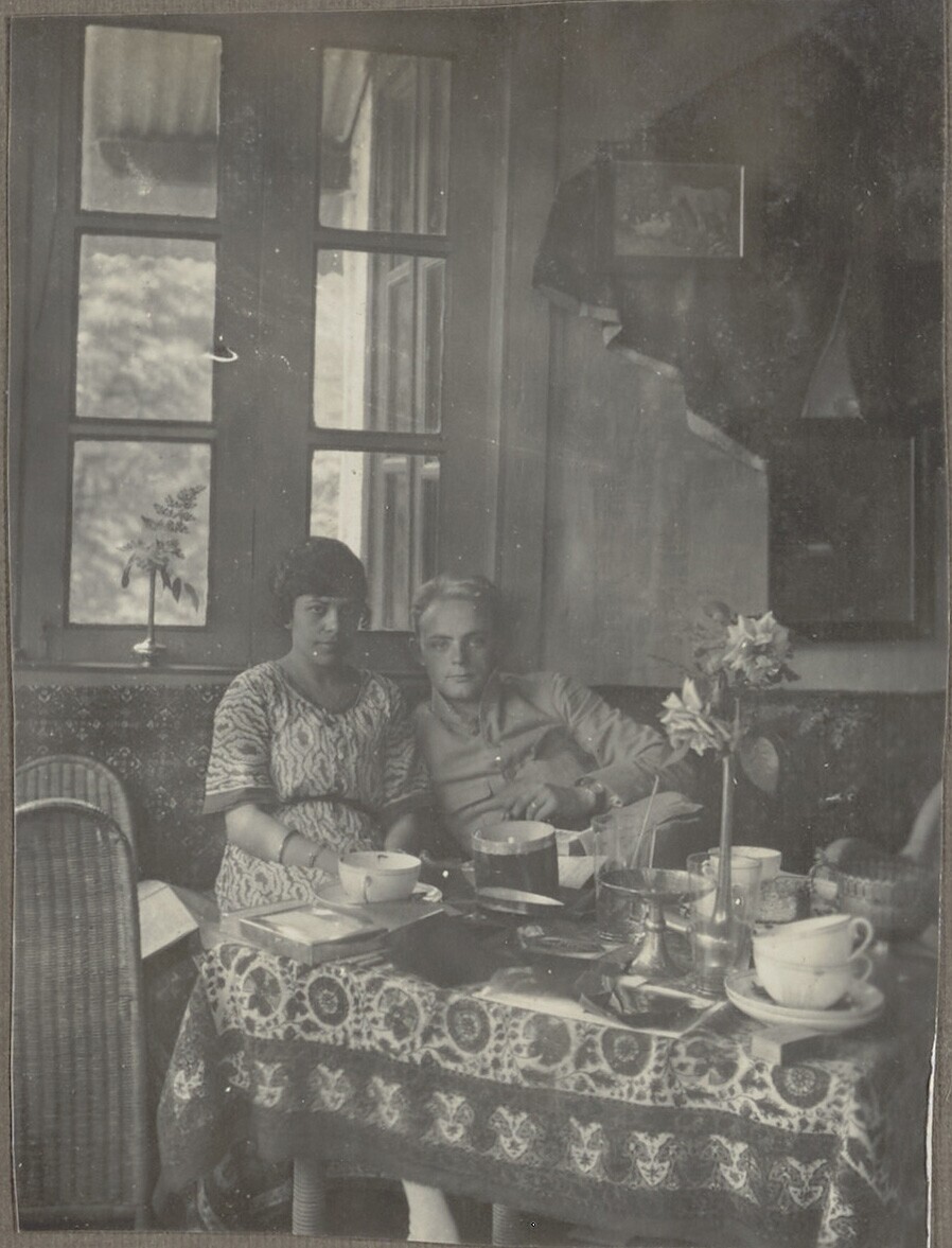 Man en vrouw poseren aan tafel