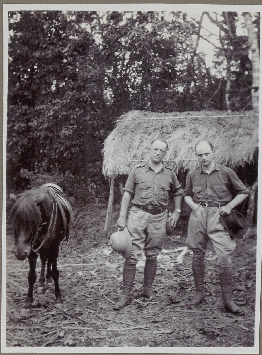 Twee manne poseren voor gebouw bij paard