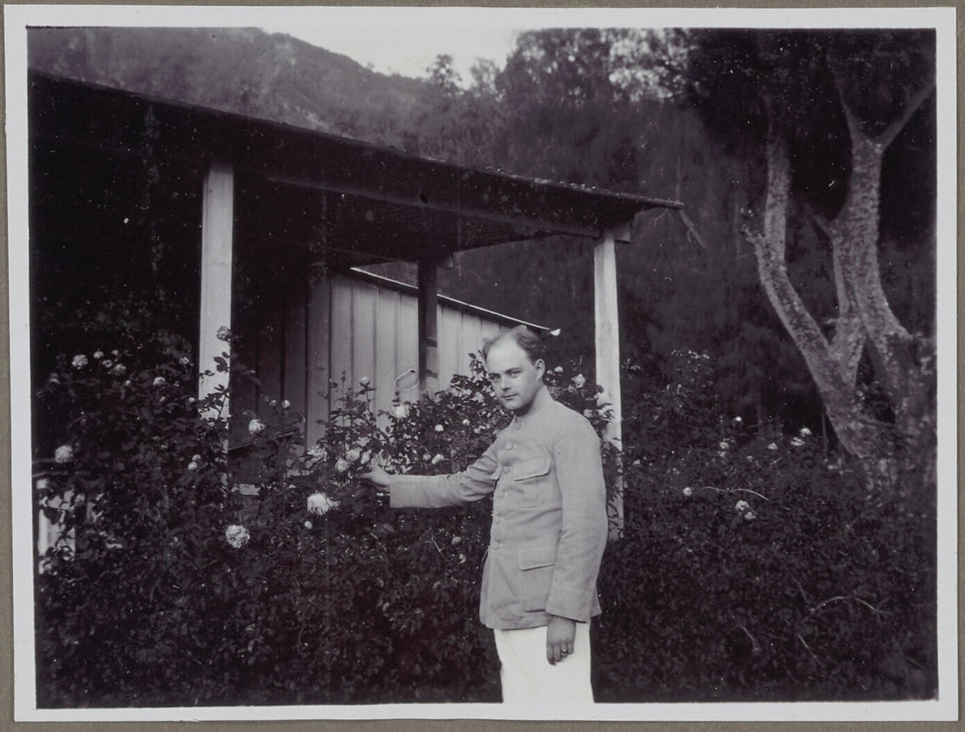 Man poseert bij rozen in tuin
