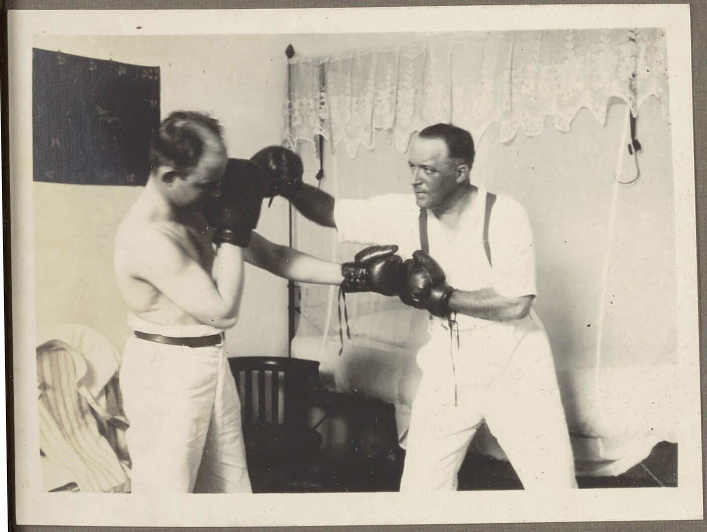 Twee mannen aan het boksen in de woonkamer