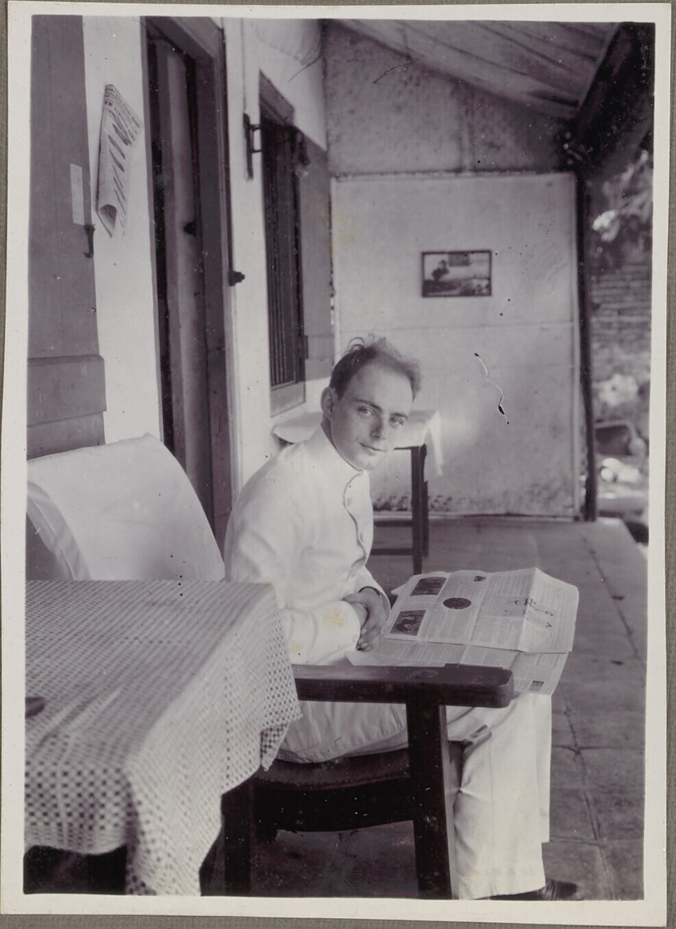 Man leest krant op de veranda
