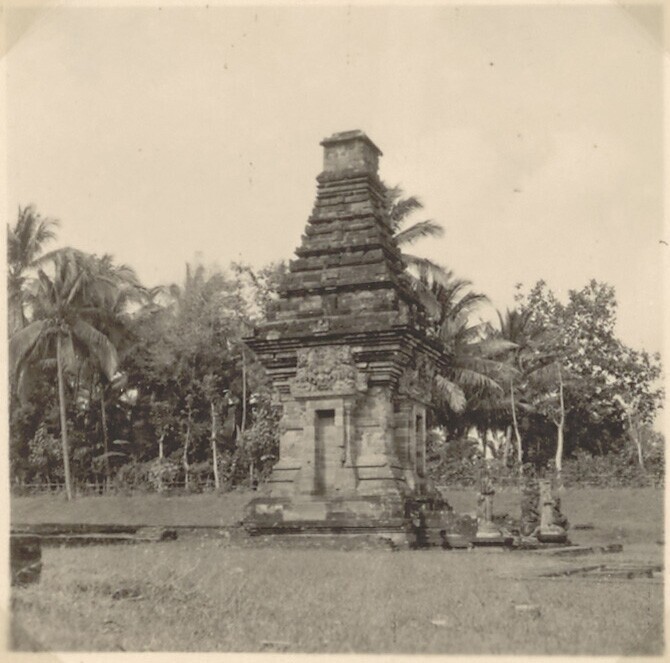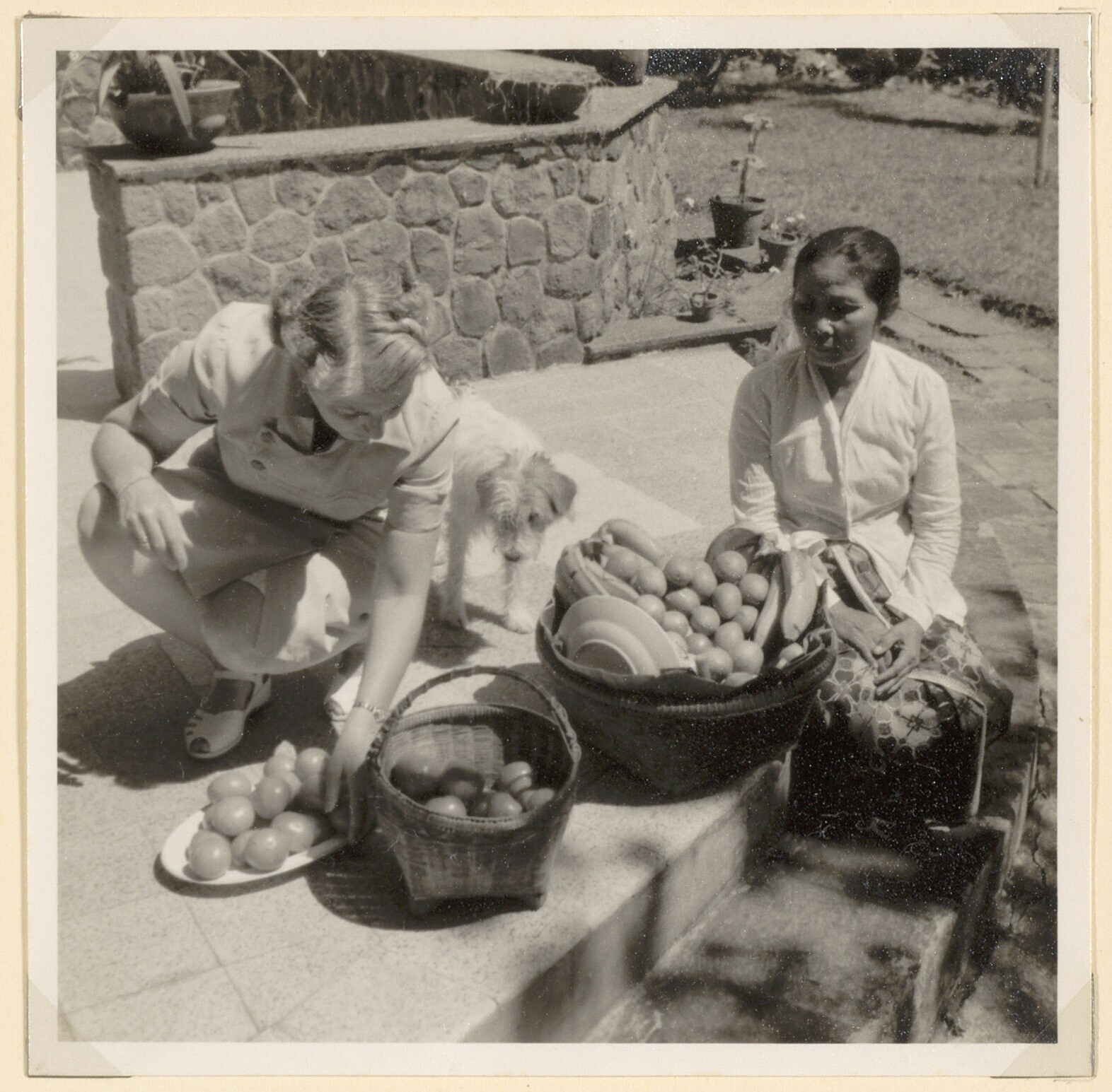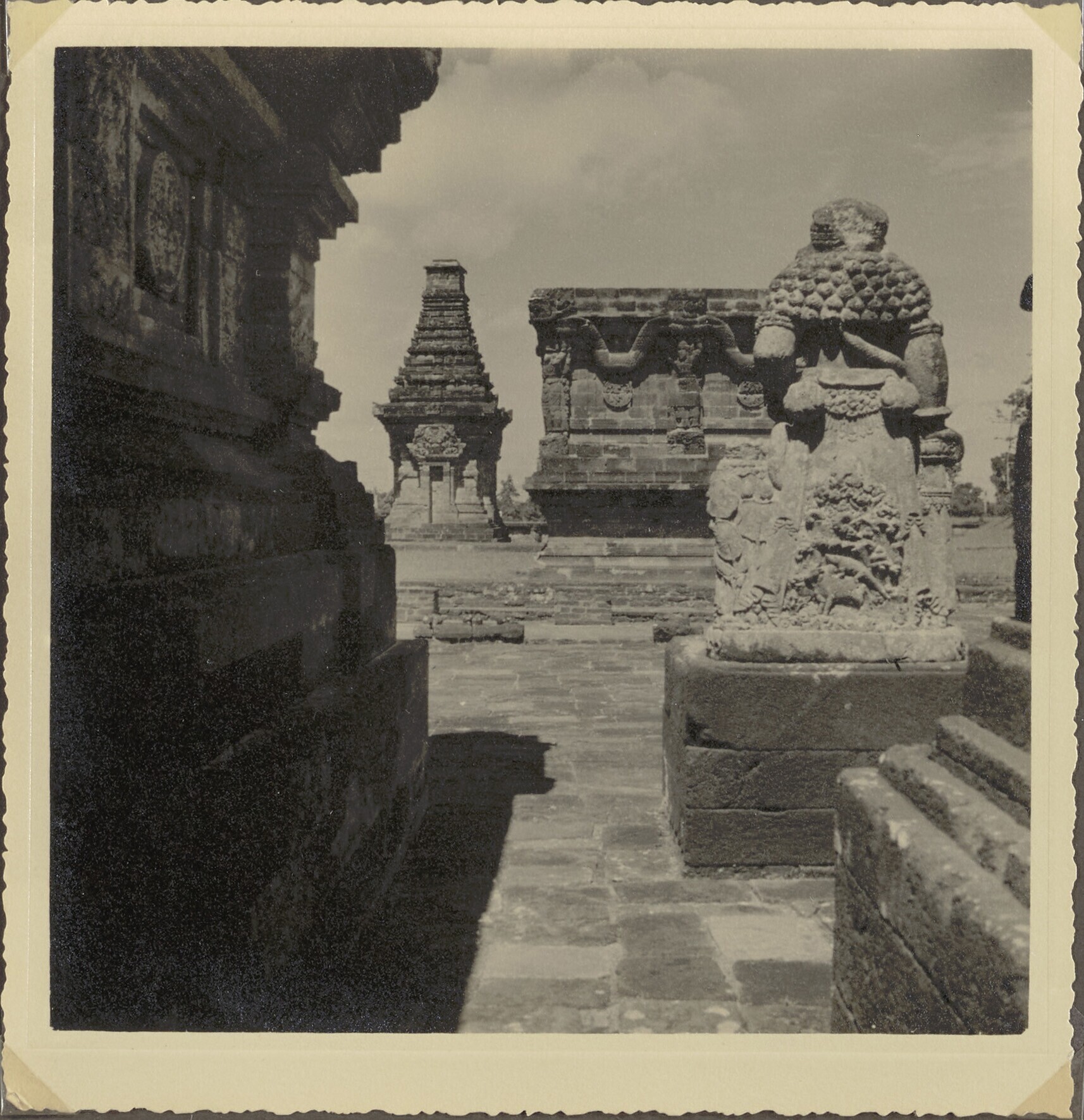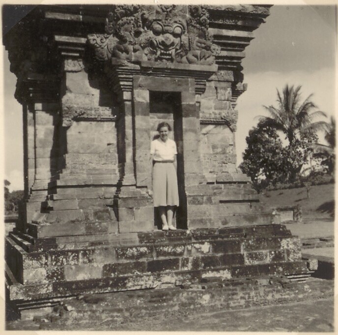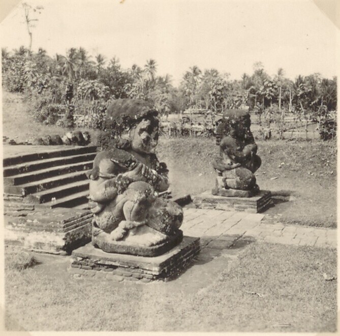 Twee Europese vrouwen en Javaanse kinderen op tempel...