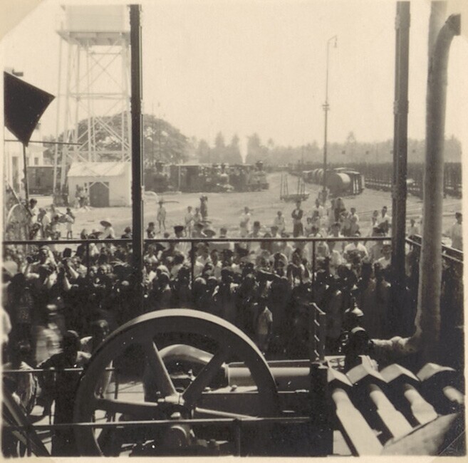Publiek bekijkt een stoommachine. Op de achtergrond ...