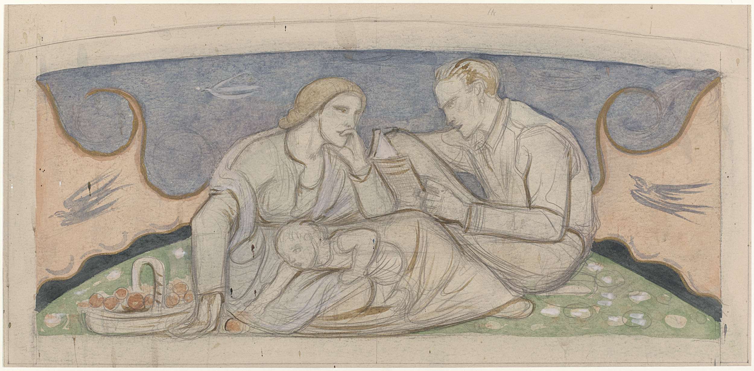 Man, vrouw en kind zittend in een landschap
