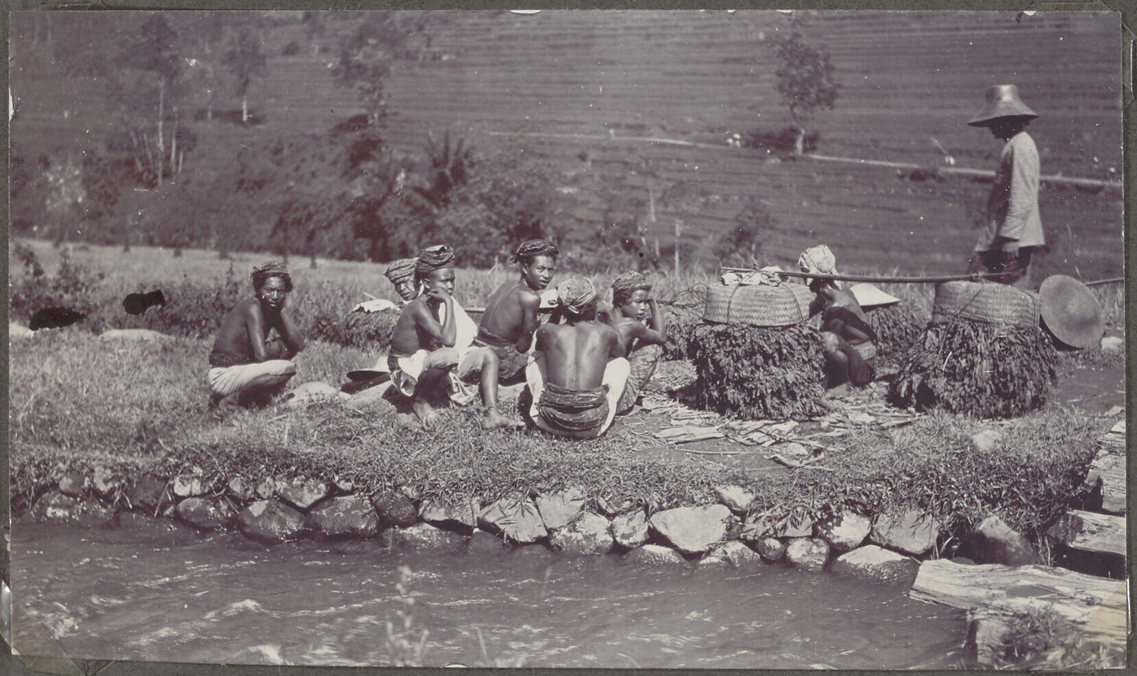 Een groep tabaksdragers die uitrusten bij een meer b...