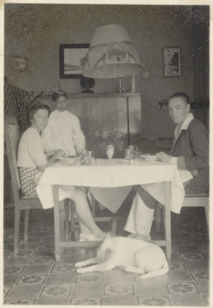 Man en vrouw die een rijsttafel eten in Pension Park...