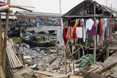 Huisjes en bootjes in een vervuilde rivier die uitmo...