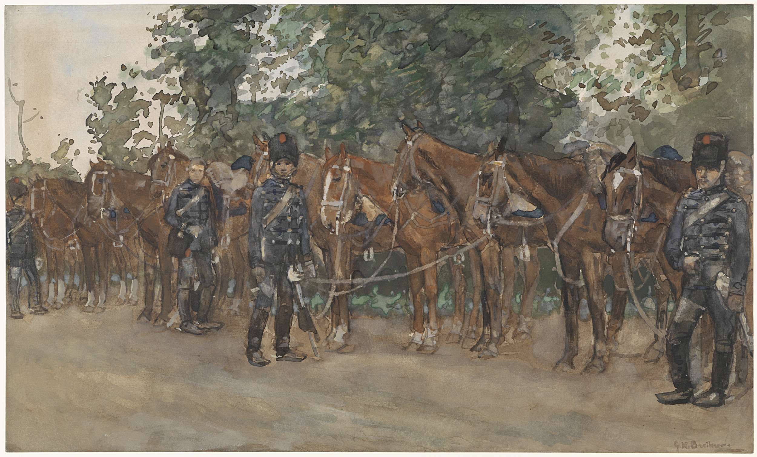 Huzaren staande naast hun paarden langs de kant van ...