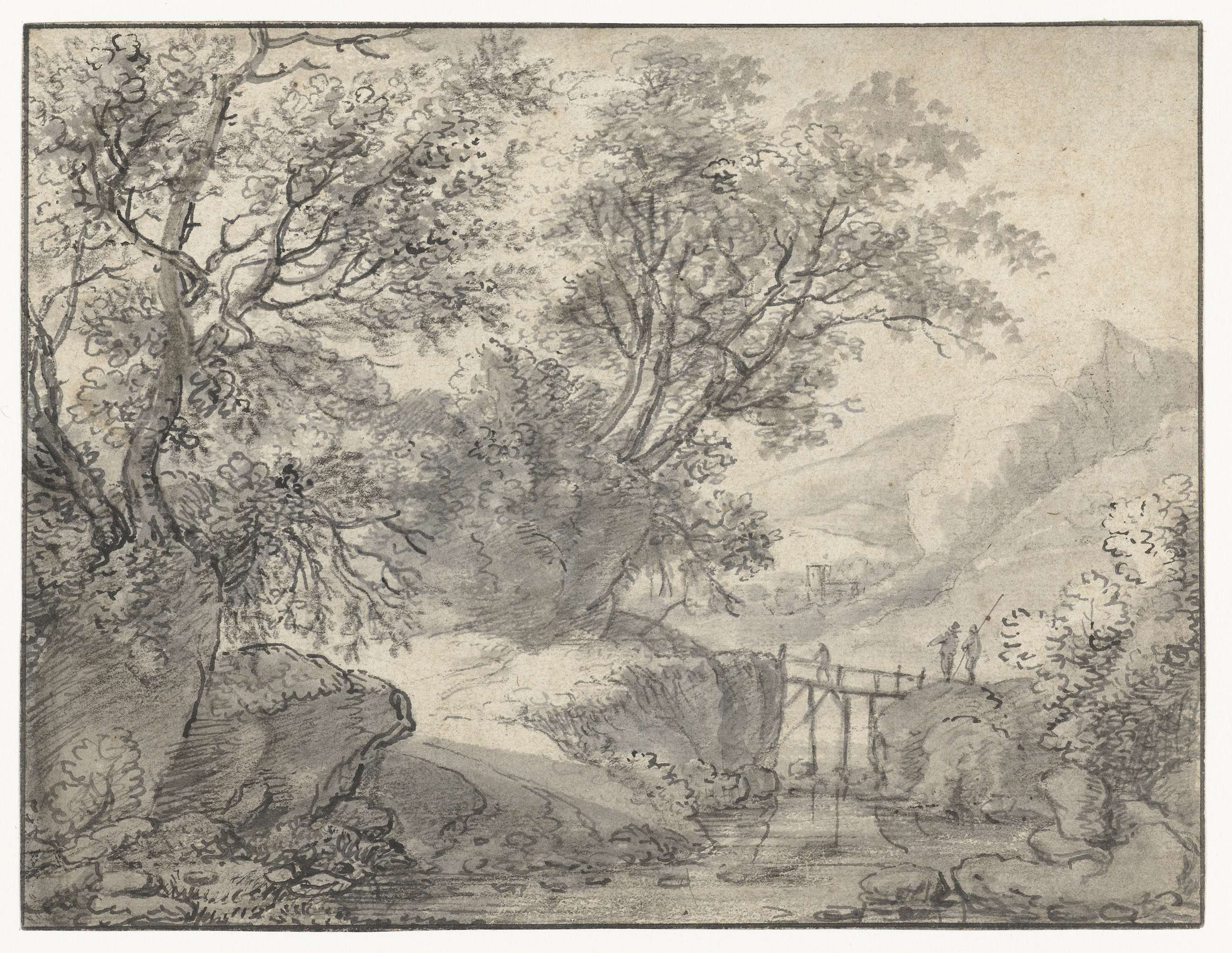 Berglandschap met bomen en een brug over een beek