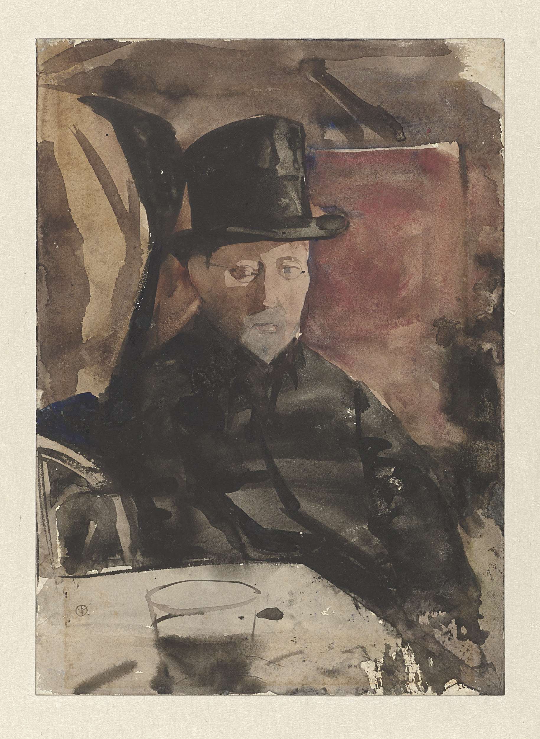 Zittende man met hoge hoed in een café