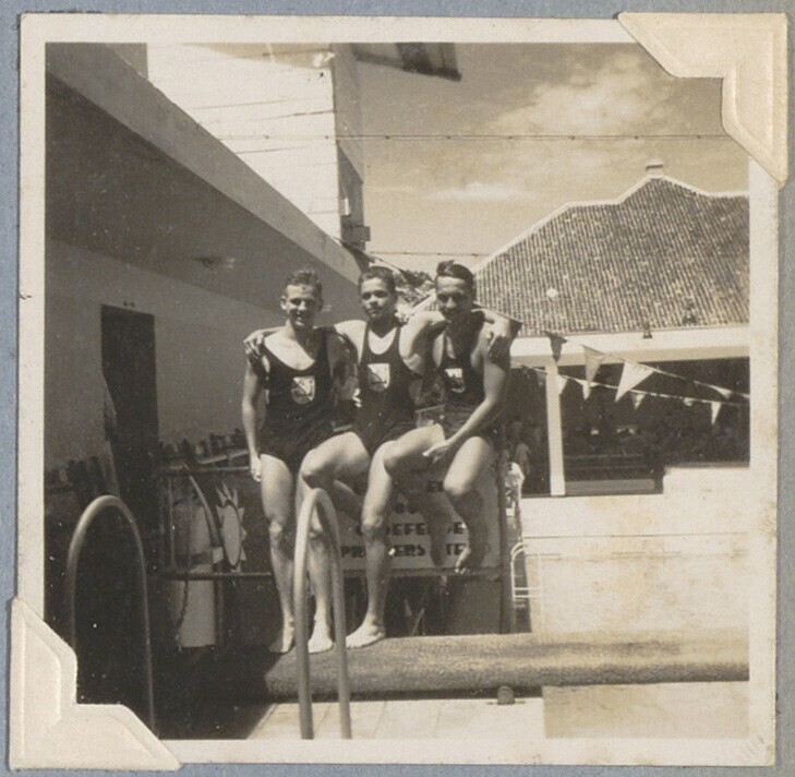 Portret van drie zwemmers tijdens Nederlands-Indisch...