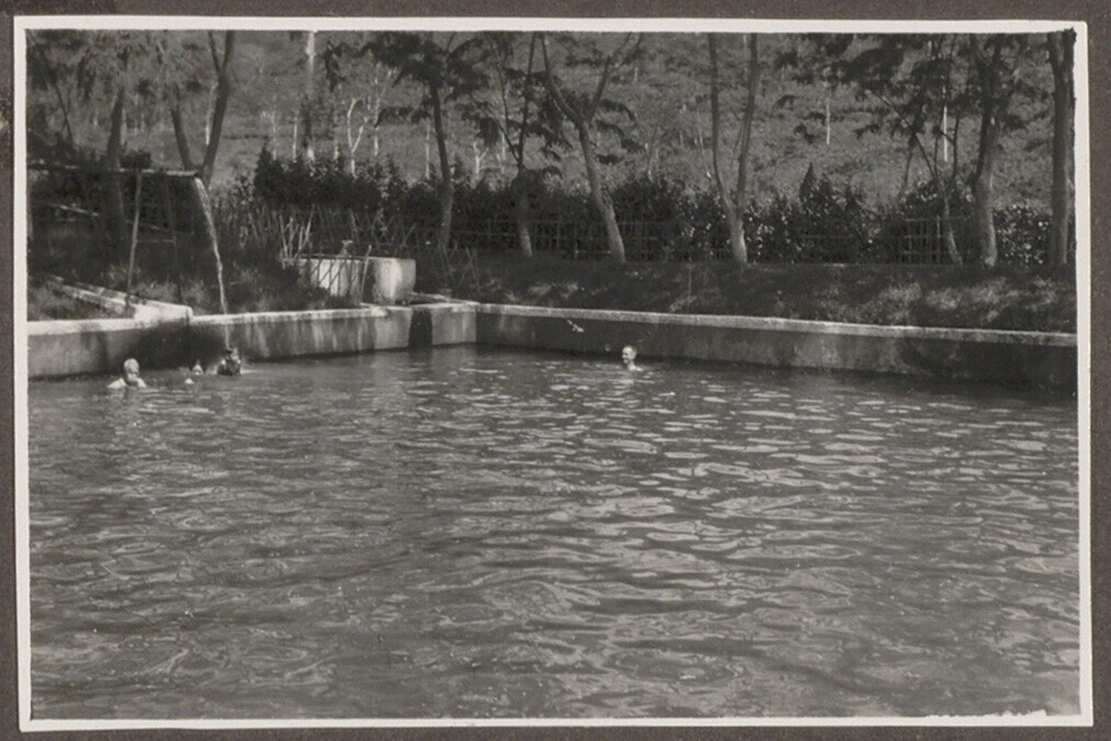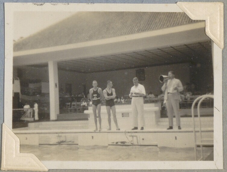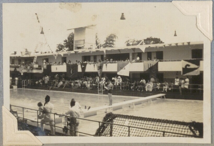 Zicht op zwembad tijdens Nederlands-Indische zwemkam...