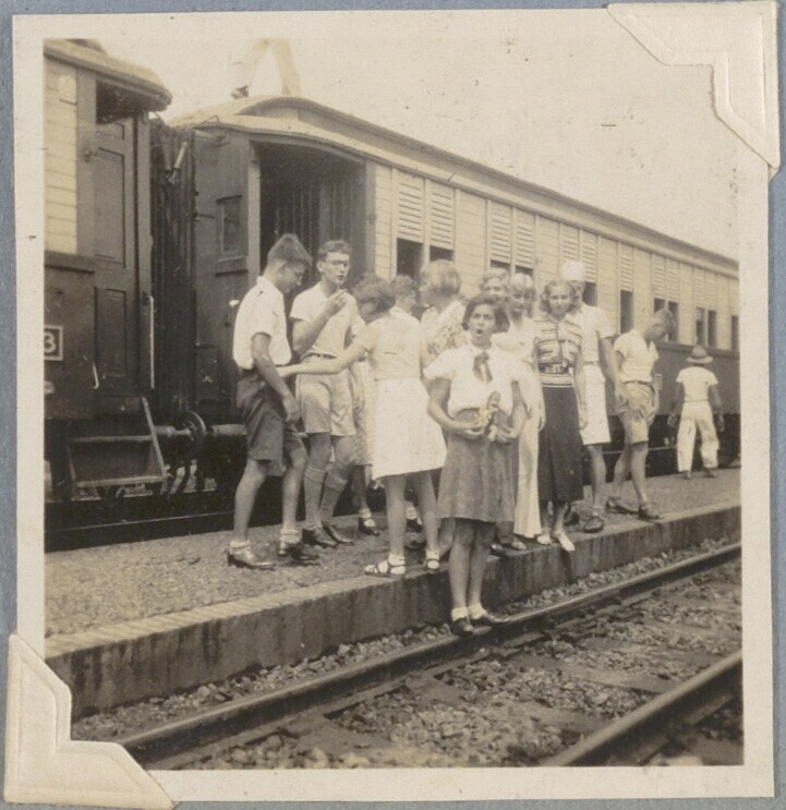 Leden van zwemvereniging op een station naast een trein