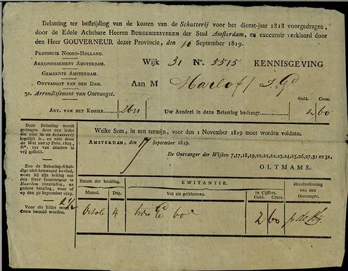 Aanslagbiljet, personele belasting, 1819