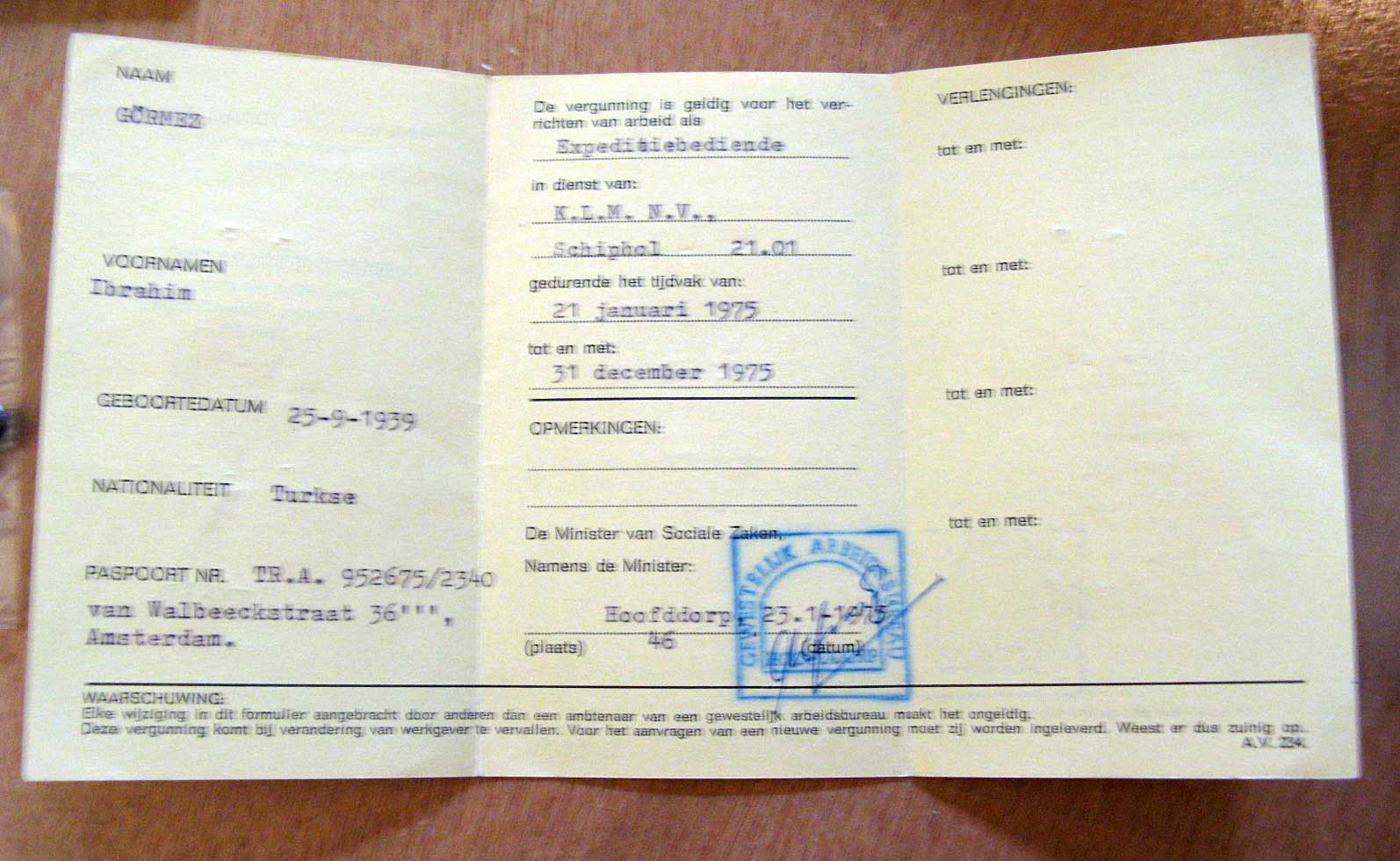 Arbeidsvergunning van Ibrahim Görmez, expeditiebedie...