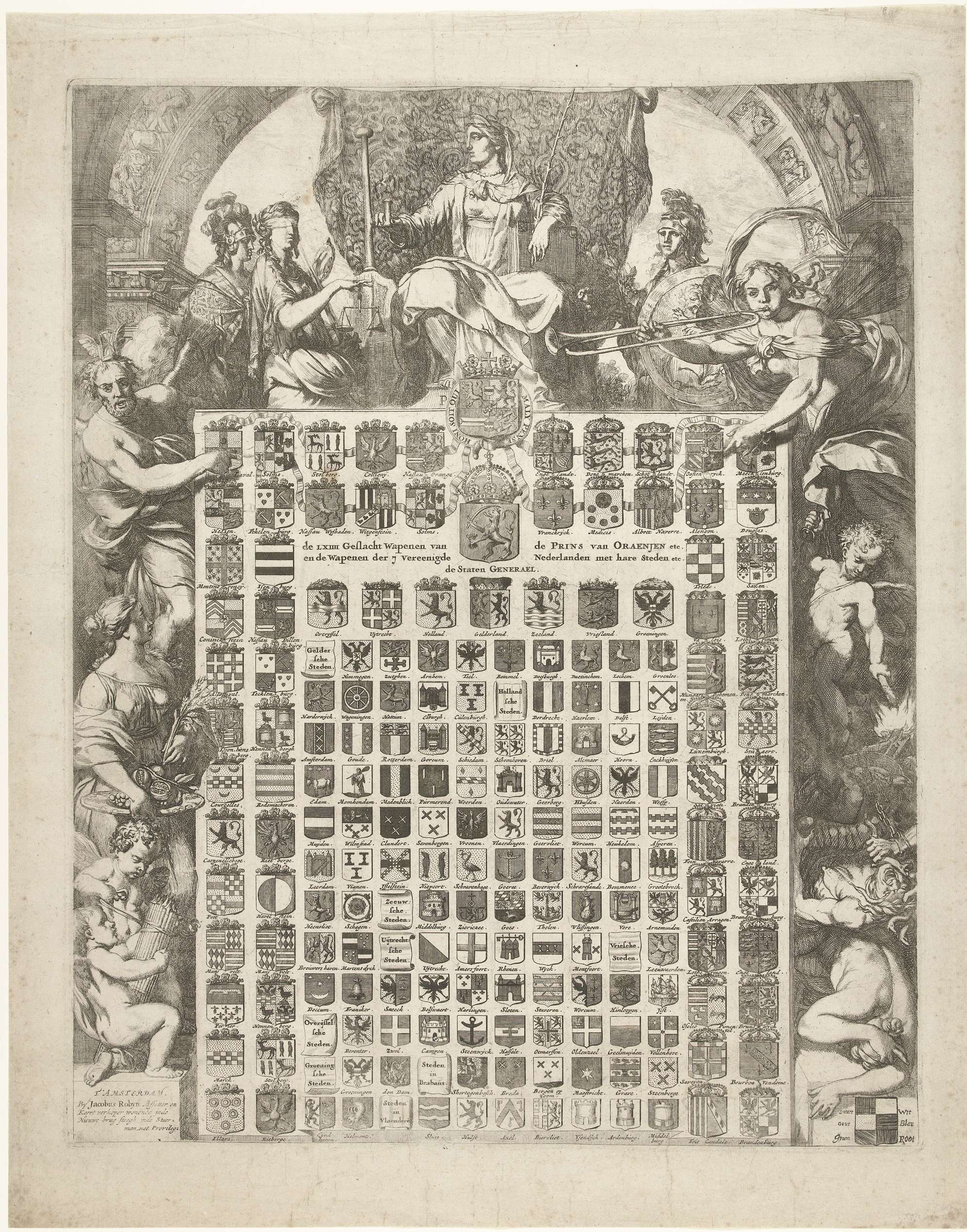 De 64 geslachtswapens van prins Willem III in een al...