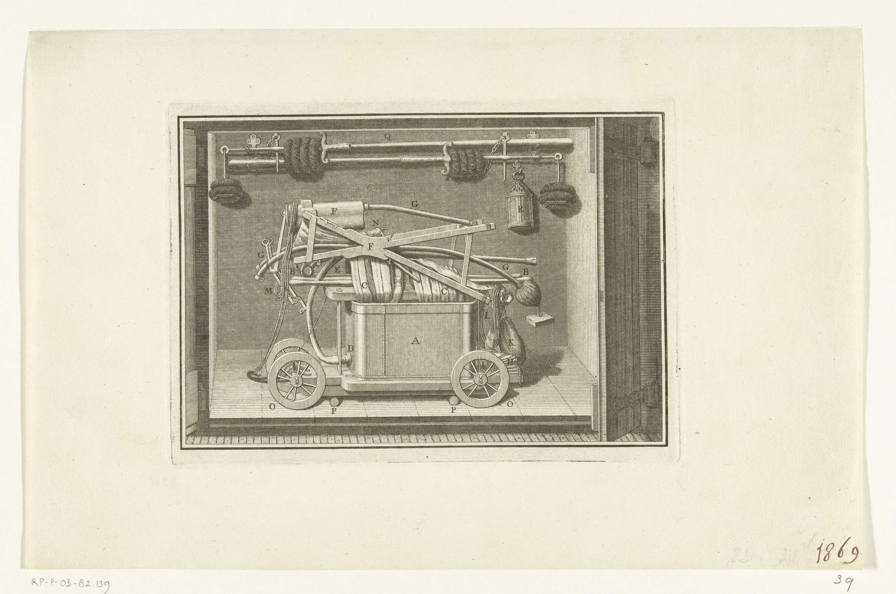 Slangbrandspuit en pomp opgeborgen in een brandspuit...