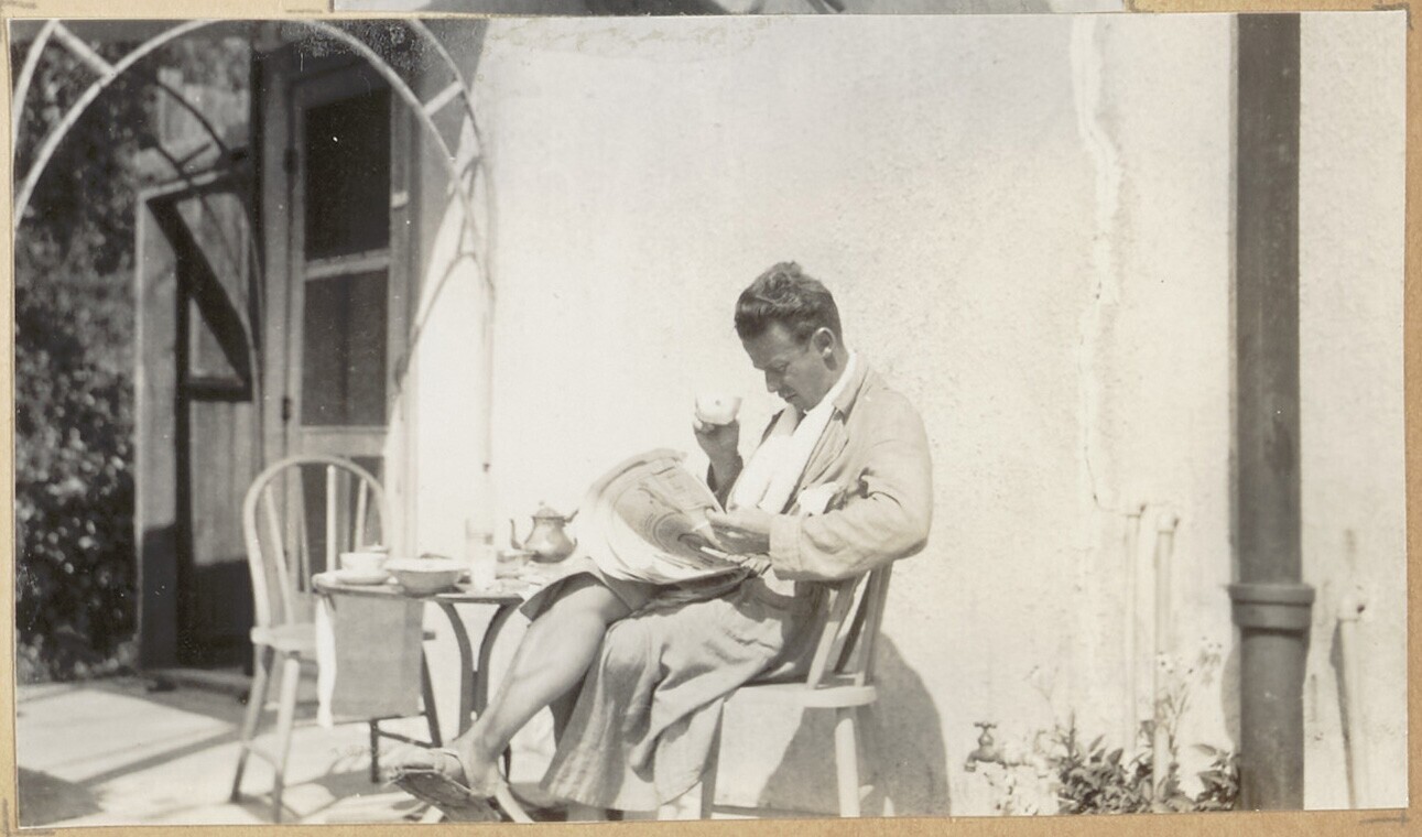 Een man die een krant leest bij zijn ontbijt in een ...