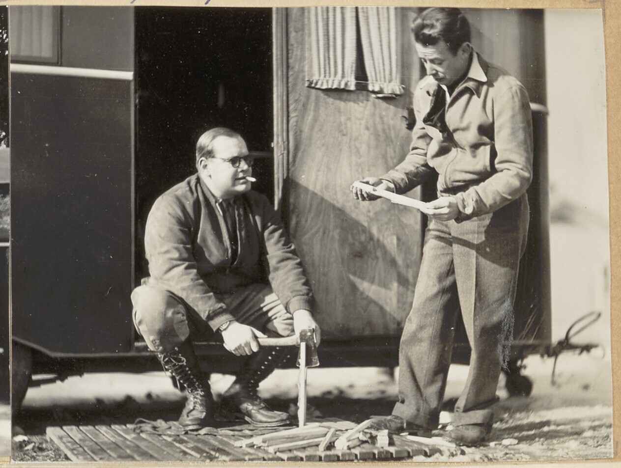 Twee mannen die kachelhout aan het hakken zijn bij h...