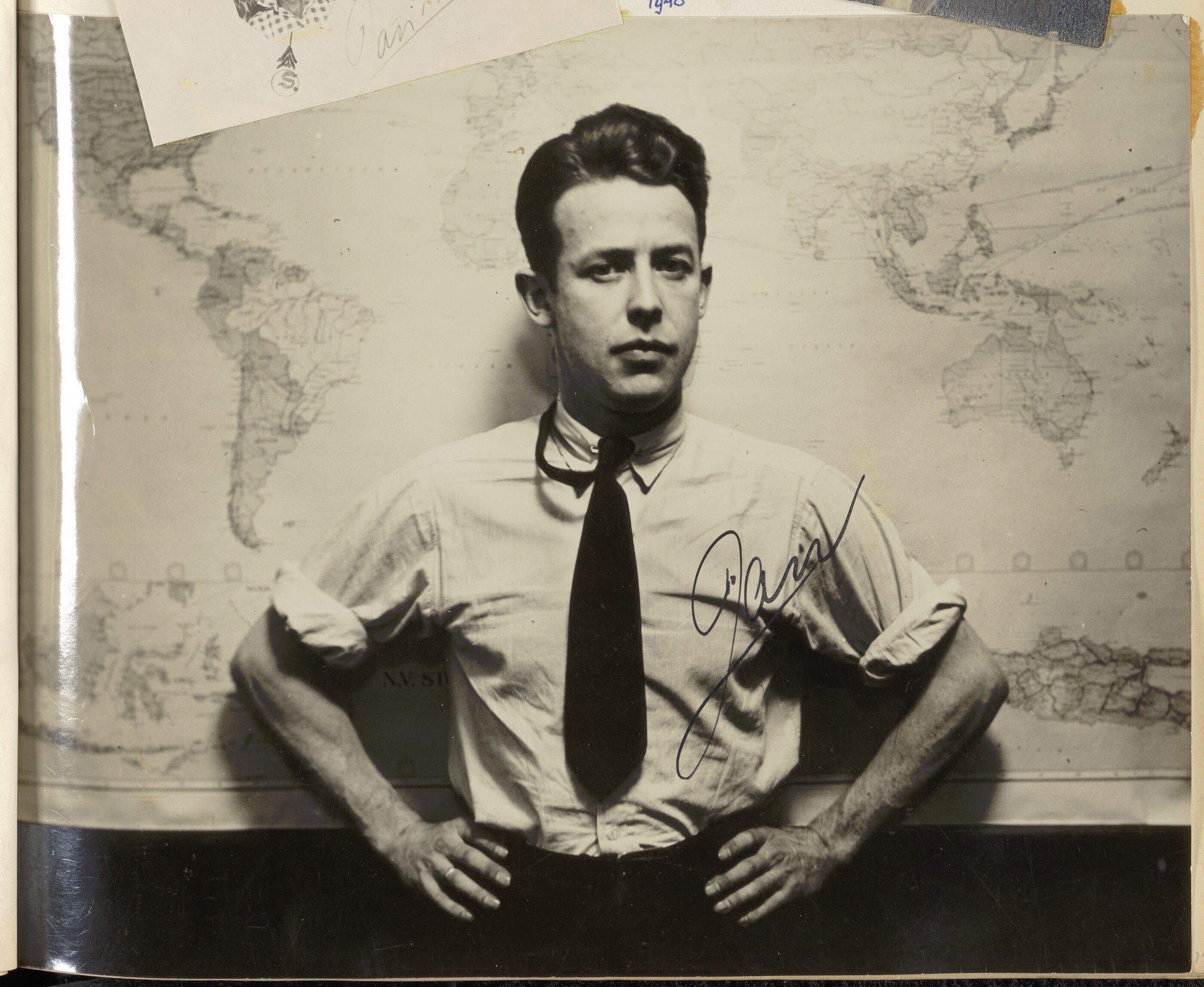 Portret van Jan houbolt die voor een wereldkaart staat