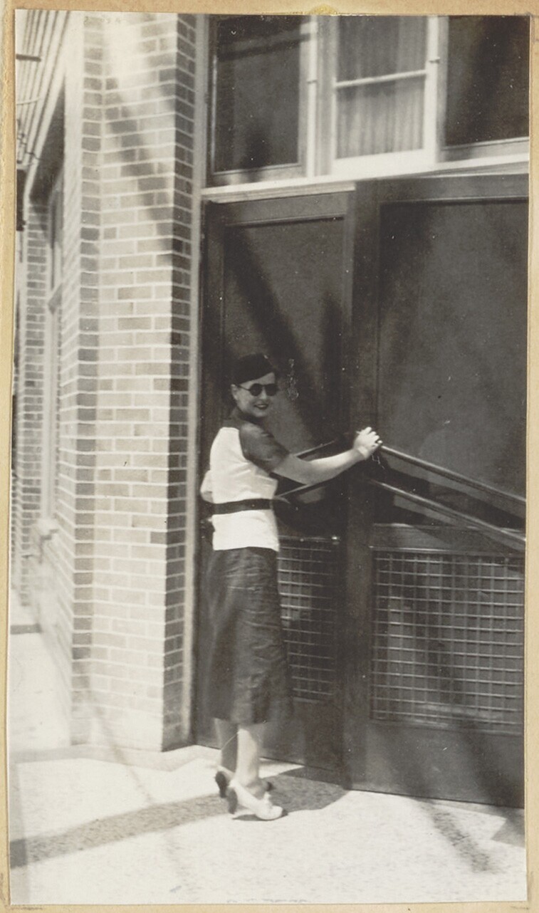 Portret van een vrouw bij woning
