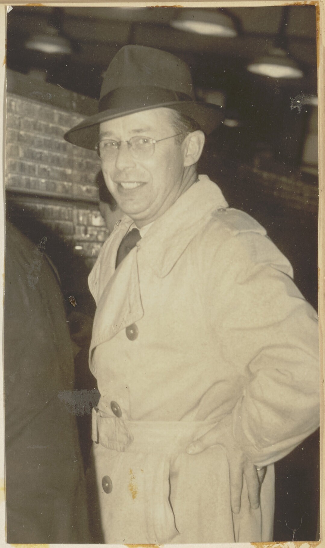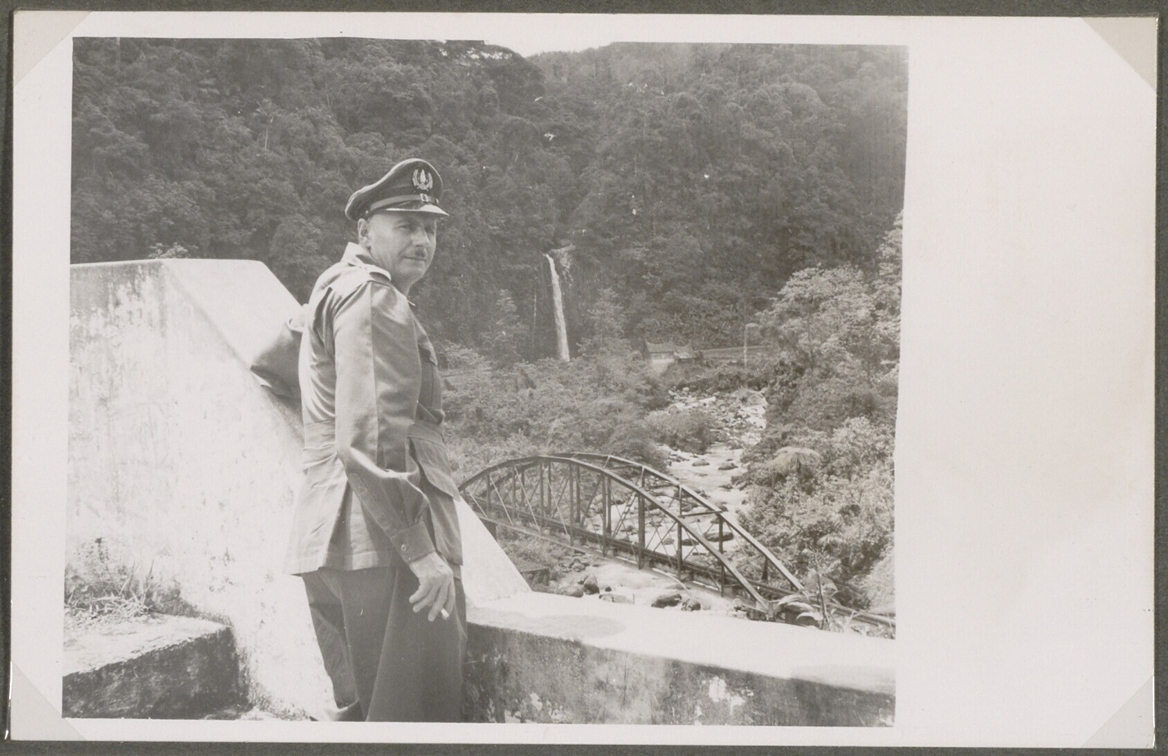Portret van een man in uniform die bij een spoorbrug...