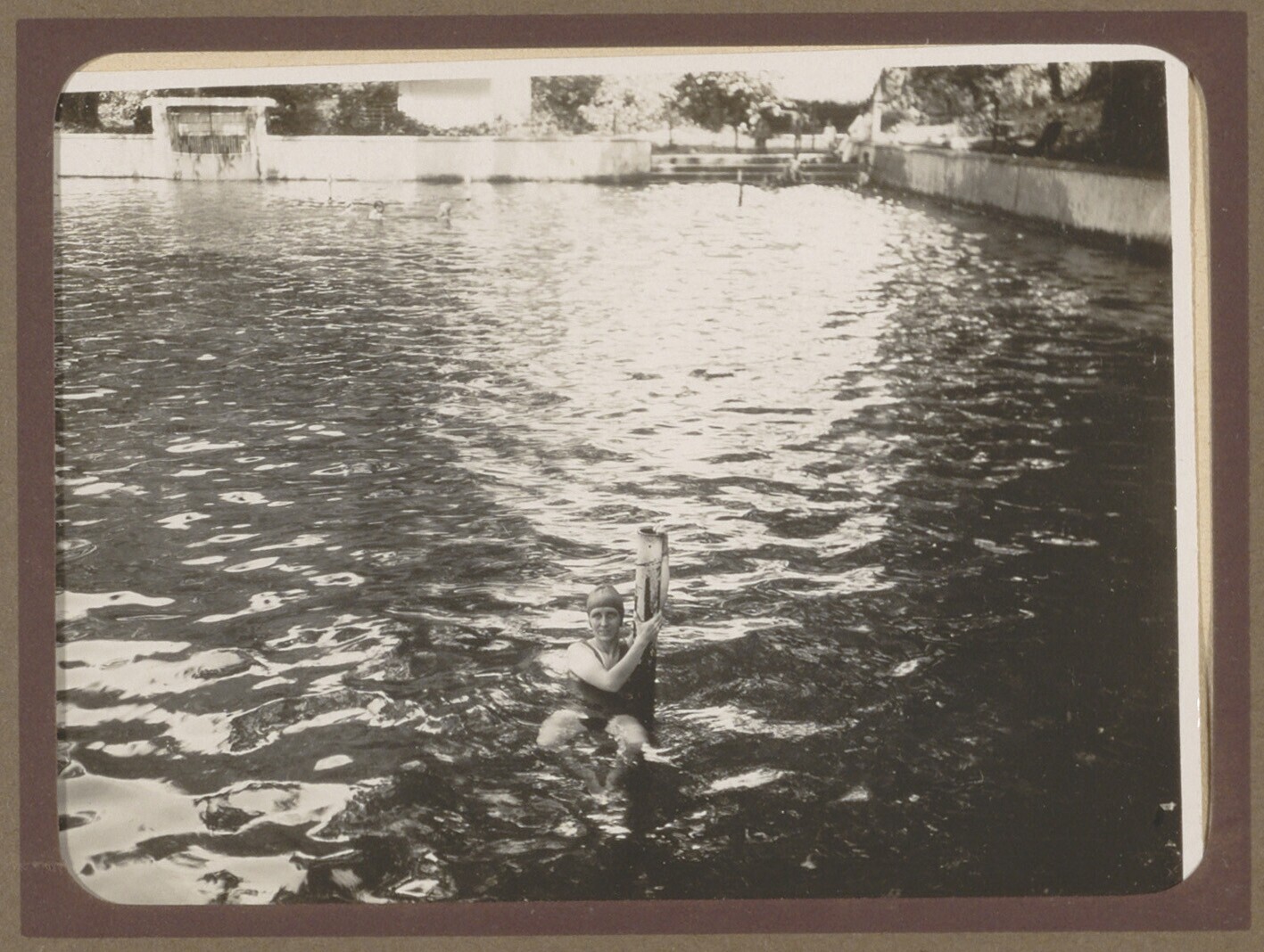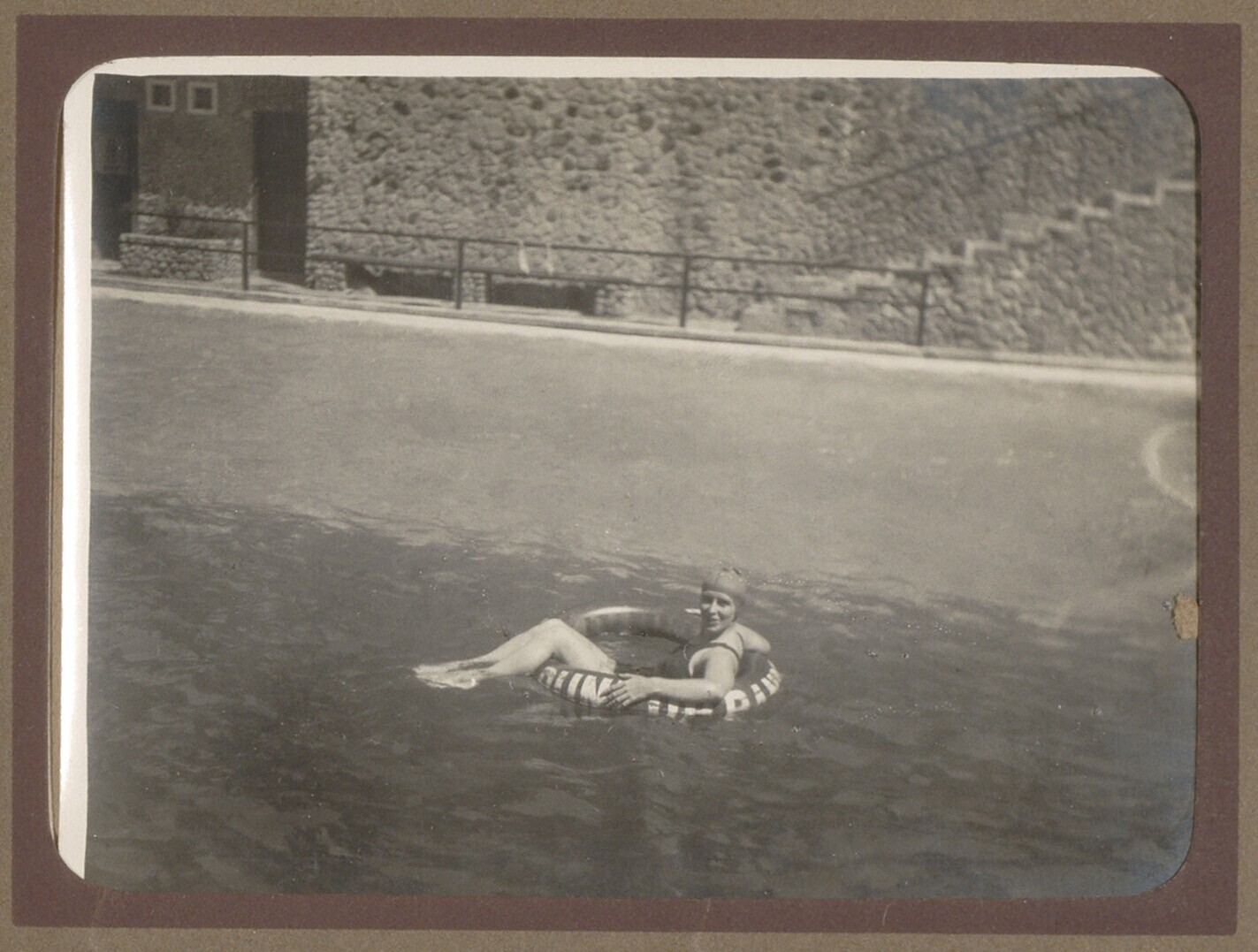 Europese vrouw in zwemkleding dobbert in een zwemban...