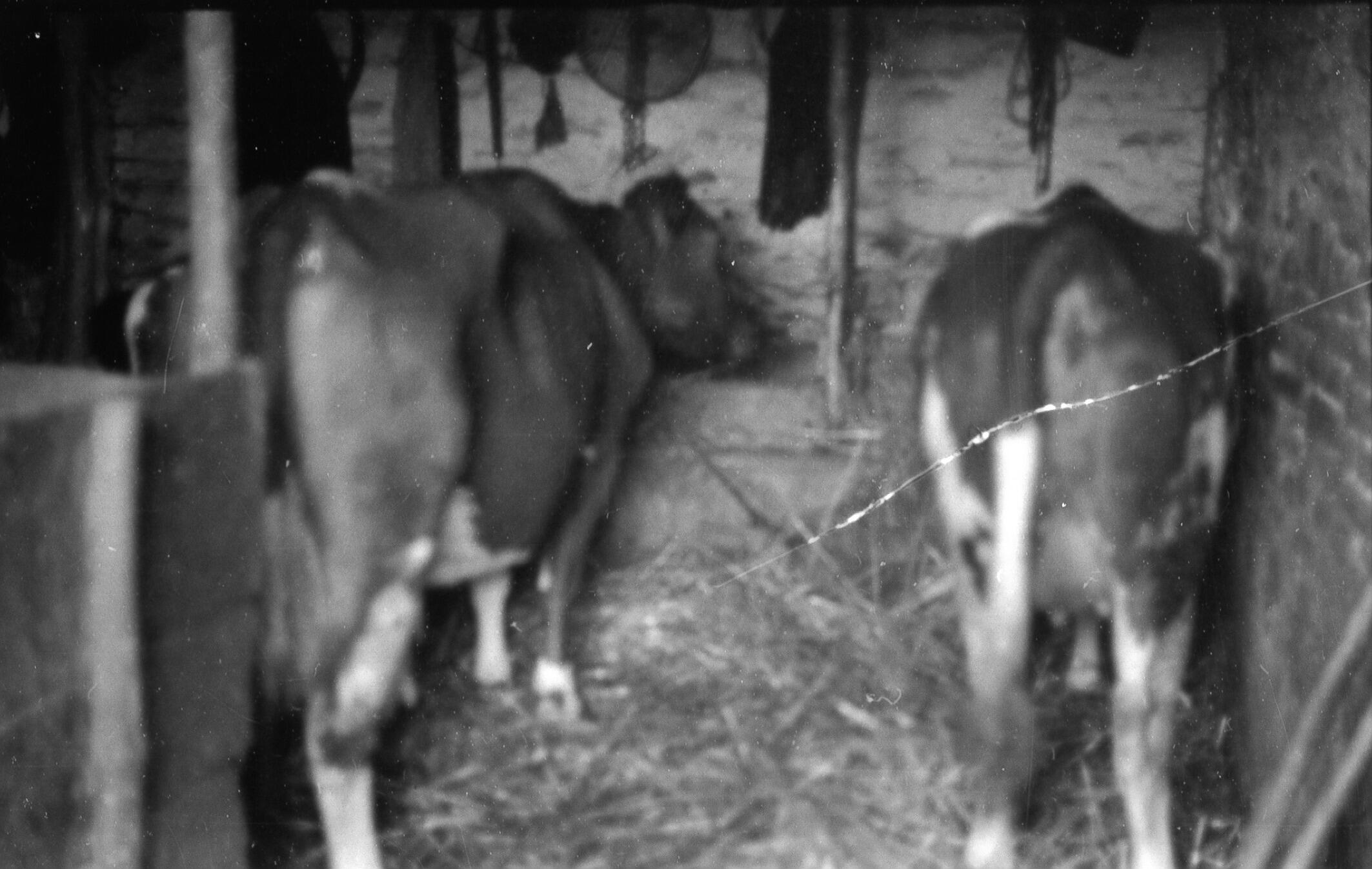 Twee koeien in een stal, Asten, 1938 (zwart-wit foto)
